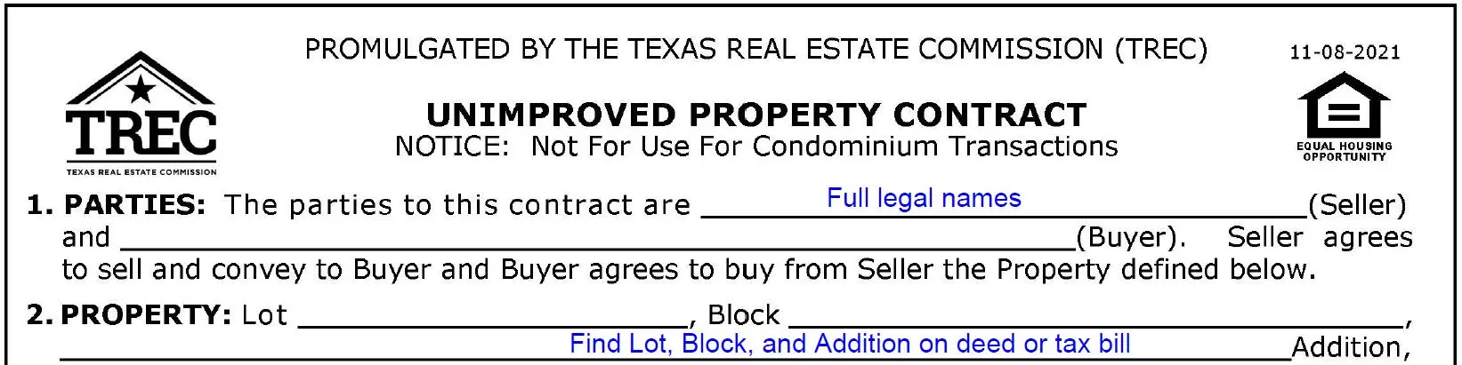 1. Parties. Use the full legal names of the buyer(s) and seller(s) as they appear on government IDs or existing property deeds.