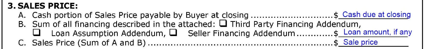 3. Sales Price. A is the cash amount due at closing (everything not being financed). B is the loan amount if any. C is the sale price.