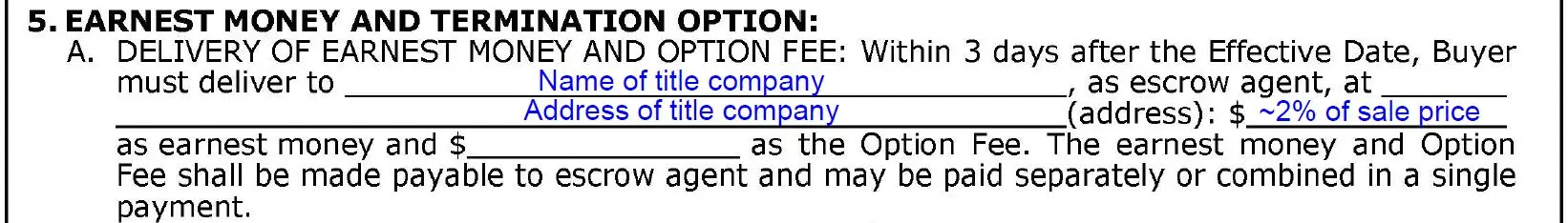 5. Earnest money and termination option. A typical earnest money amount is 1-2% of the sale price but is negotiable. Name the escrow agent, which is typically the title company handling the closing. Never give earnest money directly to the seller. The Option Fee is usually a small amount like $100. You only need to fill an option fee amount if you’re entering a termination option period in B below.