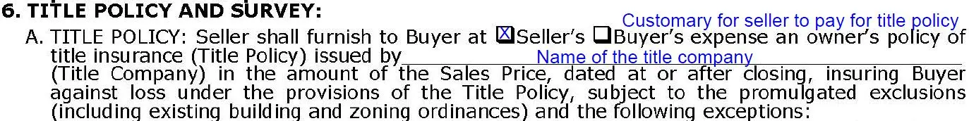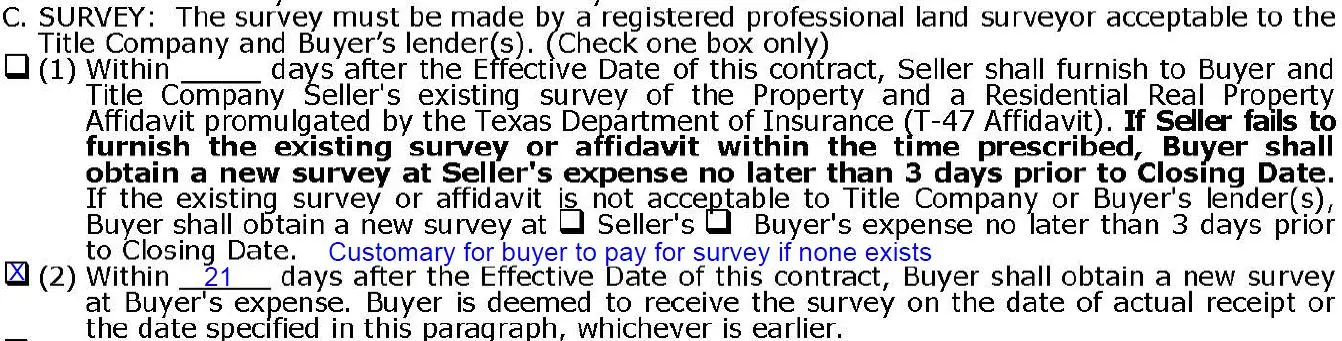 6. Title policy and survey. In Texas, it’s customary for the seller to pay for the title policy and the buyer to pay for the survey if one does not already exist. Give the buyer a reasonable timeframe (e.g., 10-21 days) after receiving the Title Commitment and Survey to raise objections or terminate based on unacceptable findings (easements, restrictions, encroachments). This is the buyer’s crucial “due diligence” or feasibility period.