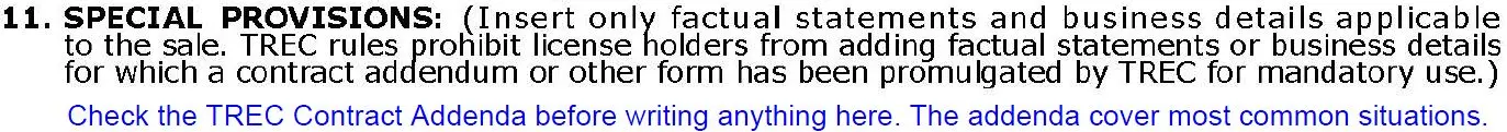 11. Special provisions. Be careful here. This is ONLY for factual statements or business details not covered elsewhere. An example might be: “Seller agrees to remove all trash and debris from Property prior to closing.” It’s not recommended to try to write legal clauses or modify contract terms yourself. Also, only use this after checking the TREC contract addenda. The addenda cover most situations.