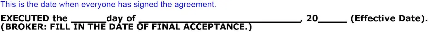 Finally, the buyer and seller sign the contract. The execution date or date of final acceptance is when the last party signs.